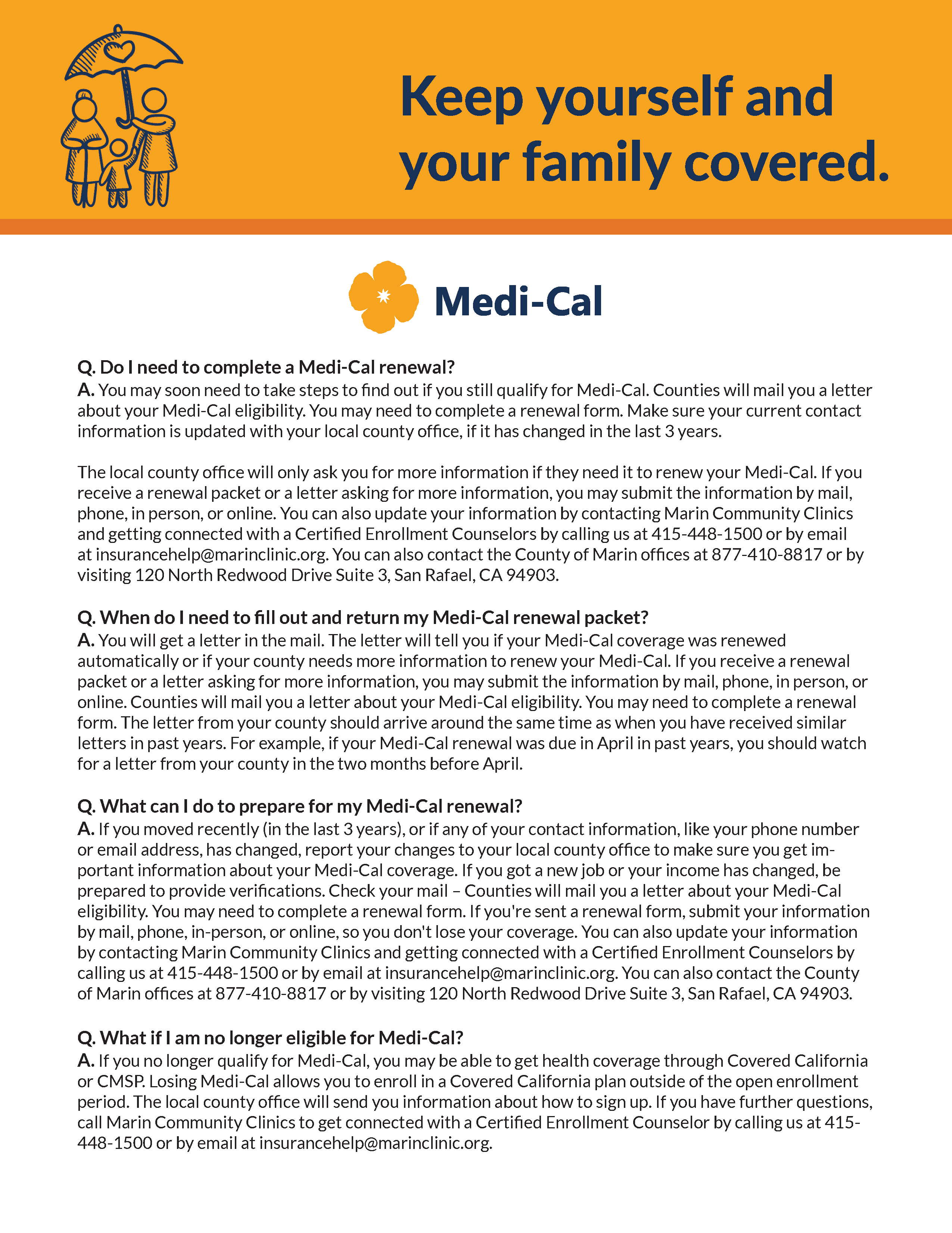 . - Complete your renewal form (if you get one) – If you received a renewal form in the mail, you may submit your information by mail, phone, in person, or online to help avoid a gap in your Medi-Cal coverage. For assistance, contact Marin Community Clinics by calling us at 415-448-1500 or by email at insurancehelp@marinclinic.org. You can also contact the County of Marin offices at 877-410-8817 or by visiting 120 North Redwood Drive Suite 3, San Rafael, CA 94903.