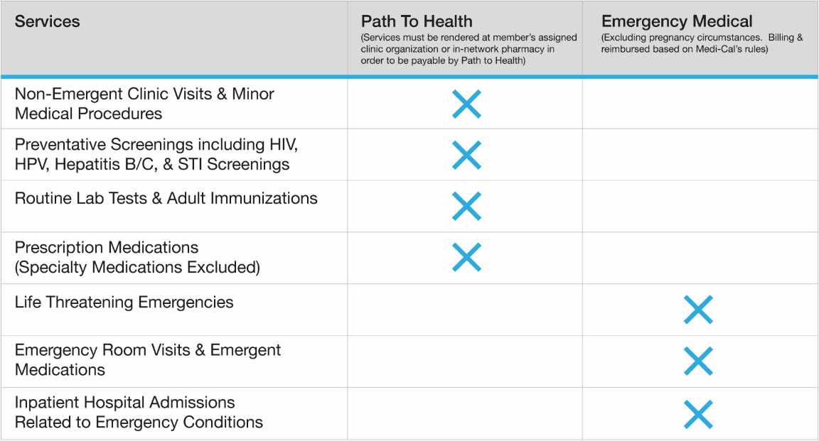 You can receive Path to Health services at the health center where you completed your application or any of that clinic’s affiliated locations participating in Path to Health. Path to Health covered benefits include: